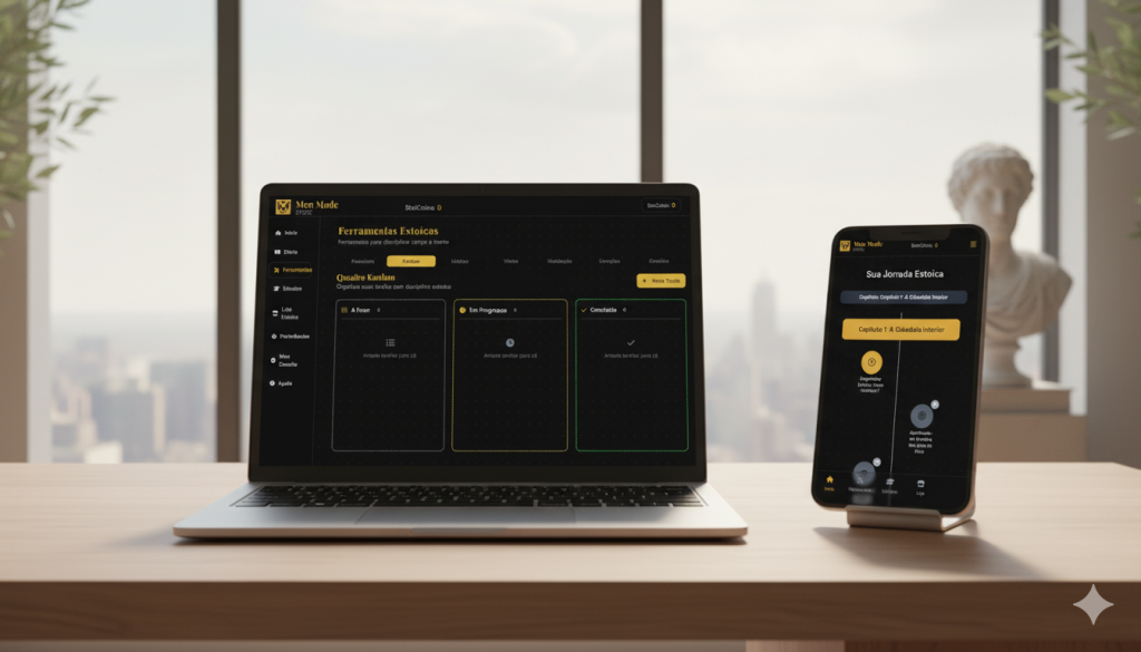 O MenmoStoic é mais do que um aplicativo; é uma jornada estruturada para transformar sua mentalidade e hábitos. Ele utiliza o localStorage para garantir que seus dados permaneçam seguros, sem necessidade de cadastro ou conexão com servidores externos funcionando até offline. Abaixo, destacamos como o aplicativo ajuda iniciantes e praticantes avançados a abraçar o estoicismo:
