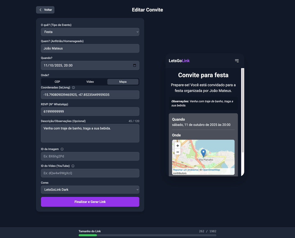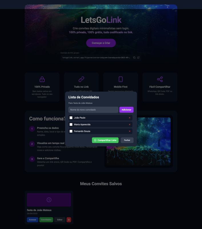 O LetsGoLink é um web app (funciona direto no navegador do celular, sem baixar nada) hospedado em letsgolink.vercel.app. Ele transforma a criação de convites em algo tão fluido quanto rolar o feed do Insta. Sem login, sem senha, sem nuvem enchendo de dados seus – tudo é codificado na URL do link que você gera. Tipo: letsgolink.vercel.app/?tipo=aniversario&quem=Joana&quando=25/09/2025. Aberto no celular de qualquer um, e pronto: o convite tá lá, lindo e responsivo.